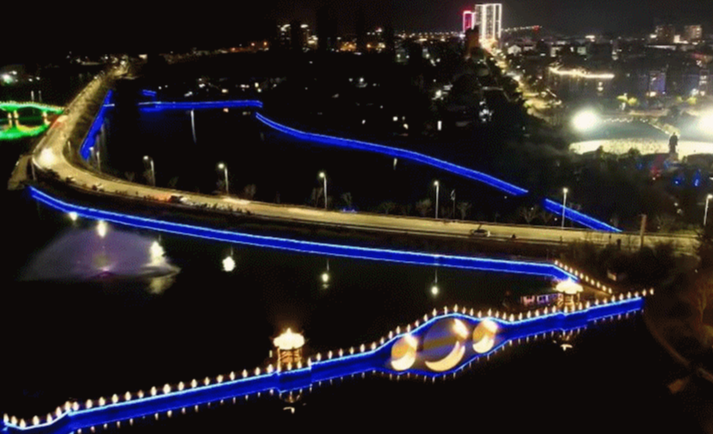 建德歷史悠久,山川秀麗,境內(nèi)古跡眾多,江、湖、巖、洞、瀑、霧等自然景觀豐富多彩,地處杭州-千島湖-黃山這條黃金旅游線的中段。此次完工的項(xiàng)目位于建德市乾潭鎮(zhèn),胥溪是富春江支流,是乾潭鎮(zhèn)的主要河流,燈光秀項(xiàng)目作為胥溪治理工程的一部分,為胥溪煥發(fā)了新的生機(jī)和活力。